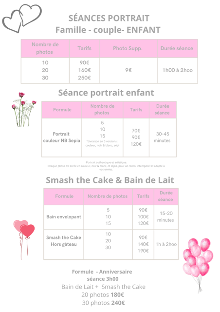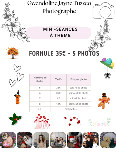 Des Minis séances à thème sont organisées tout au long de l'année afin d'immortalisé des moments unique et saisonniers tout au long de l'année. Ambiance festive ou univers poétique… une courte séance, de belles émotions, et des souvenirs à conserver.